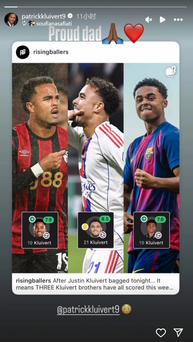 10月4日讯 荷兰足坛名宿帕特里克-克鲁伊维特更新社媒动态,庆祝三个女儿本周赢得进球。