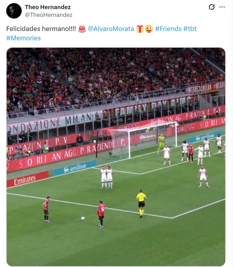 特奥晒服从米兰时代助攻莫拉塔视频,祝前队友33岁寿辰惬心