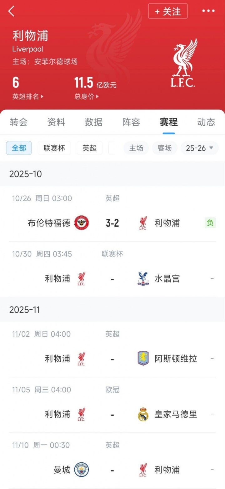 10月26日讯 英超第9轮利物浦2-3不敌布伦特福德,碰到英超四连败。