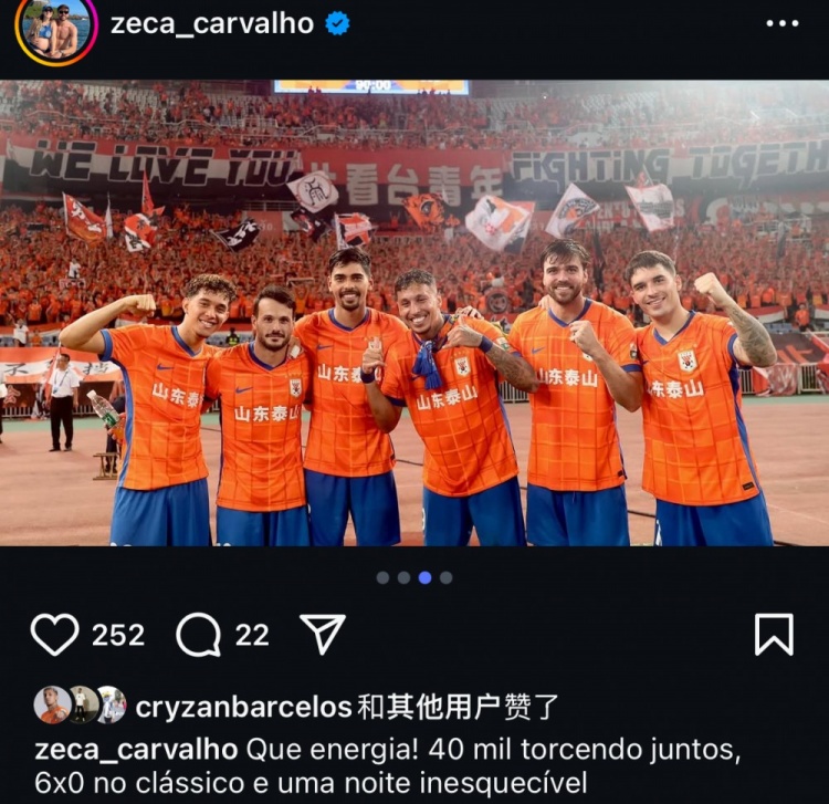 9月2日讯 今天,泰山外助泽卡更新社媒,庆祝泰山6-0大捷国安。