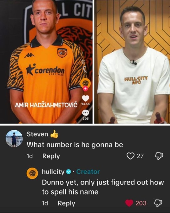 皮一下很兴奋!赫尔城社媒玩笑:新援穿几号?才知说念他名字怎么拼