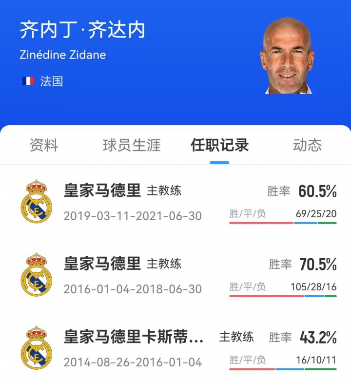 王人达内2021年再度卸任皇马主帅一职后便一直失业,他曾指导皇马得回欧冠冠军、西甲冠军等多项荣誉。
