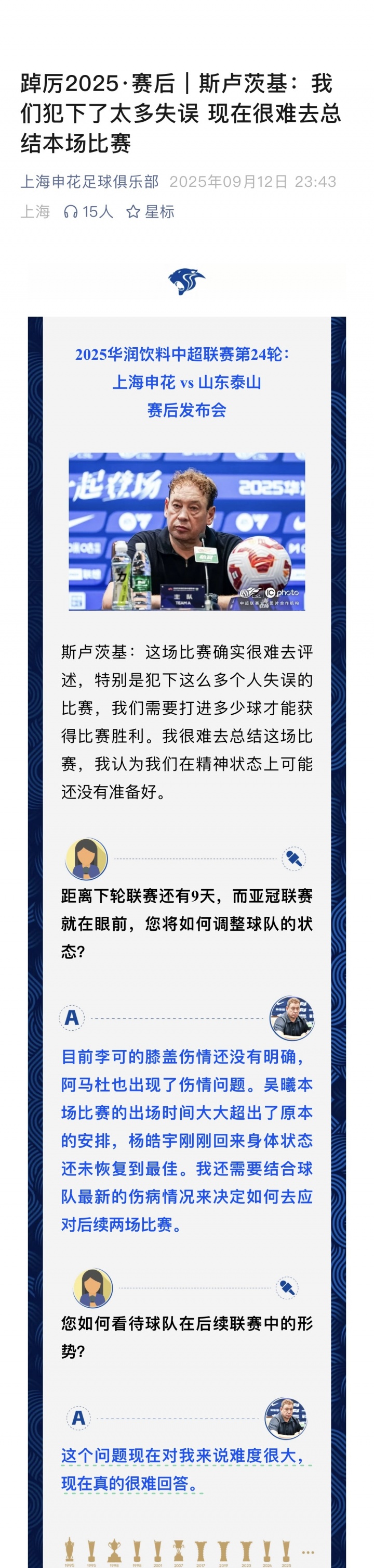 上海申花3-3被山东泰山逼平后,斯卢茨基赛后语出惊东说念主,直言“思死的心皆有了”,不外这番话并莫得获取上海申花官方社媒的“遴荐”。