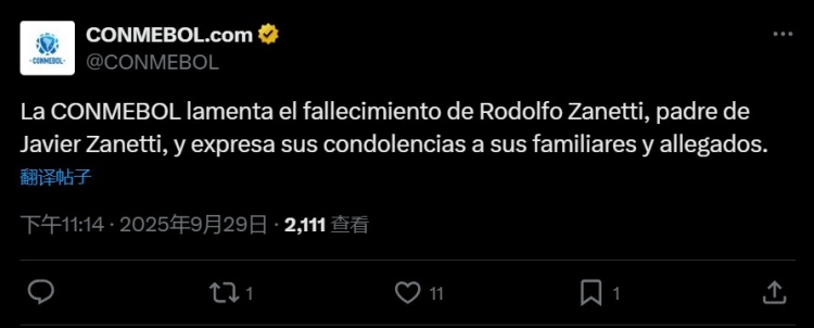 南好意思足联写谈:“南好意思足联对萨内蒂的父亲鲁谈夫-萨内蒂的死字默示哀吊,并向他的家东谈主和一又友致以竭诚的慰问。”