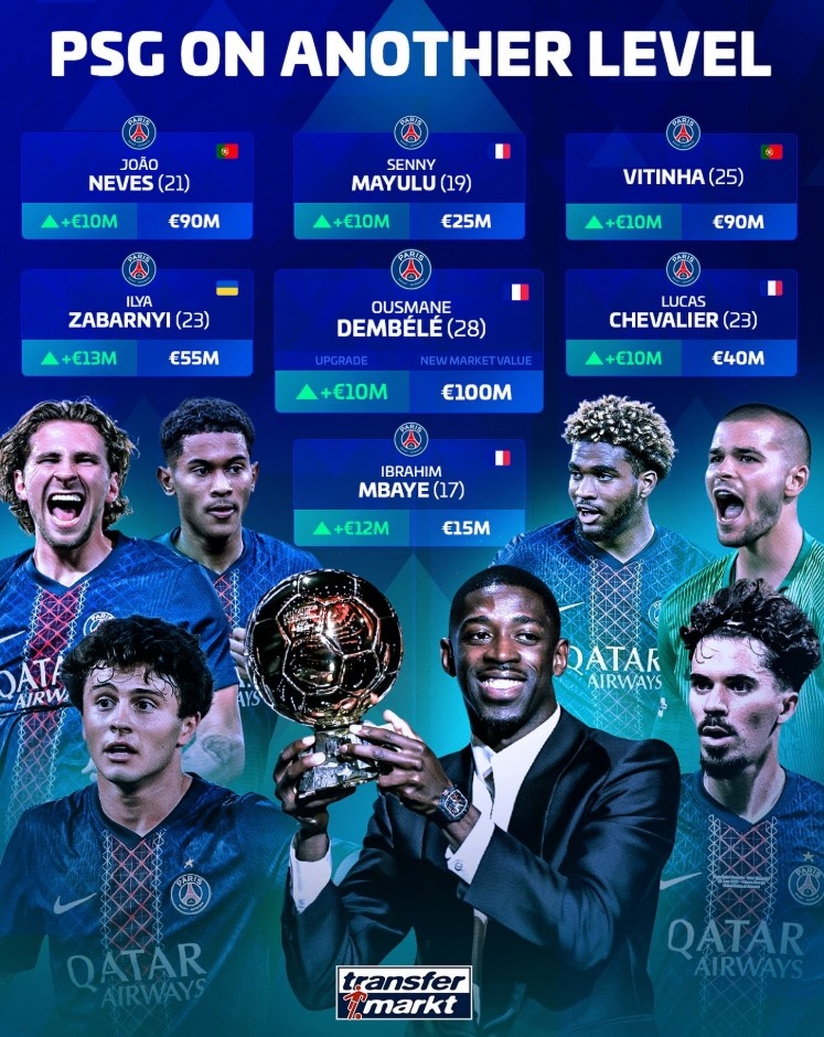 德转列巴黎多东说念主身价高潮:登贝莱、维蒂尼亚、内维斯在列