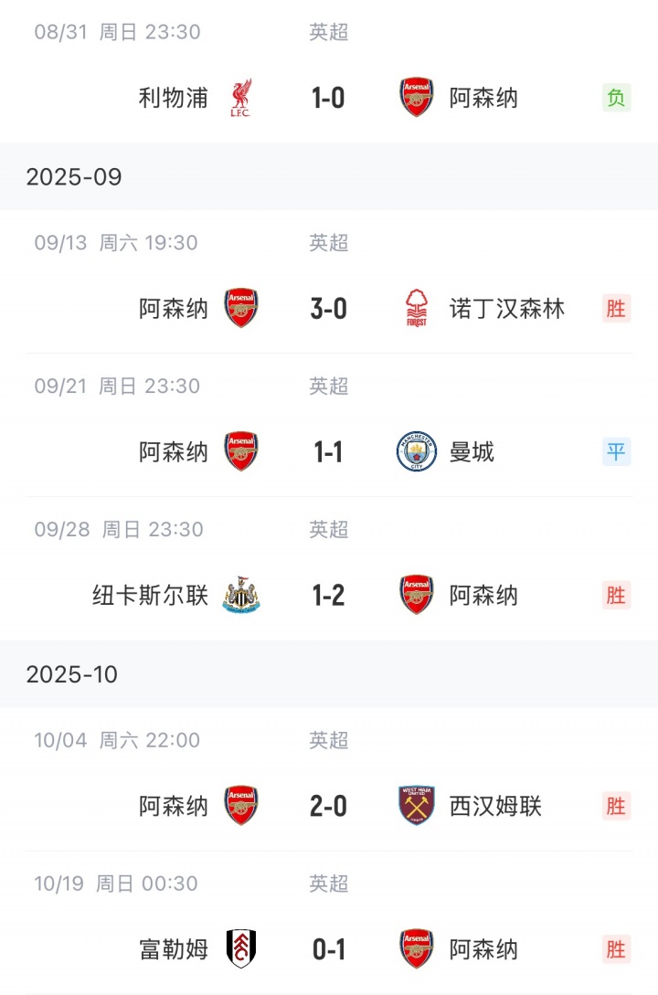 阿森纳联赛主场战平曼城后赢得三连胜,如今以3分上风领跑。