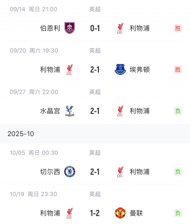 利物浦第五轮时一度卓著阿森纳5分,随后先后不敌水晶宫、切尔西和曼联,联赛名次掉至第四落伍榜首4分。