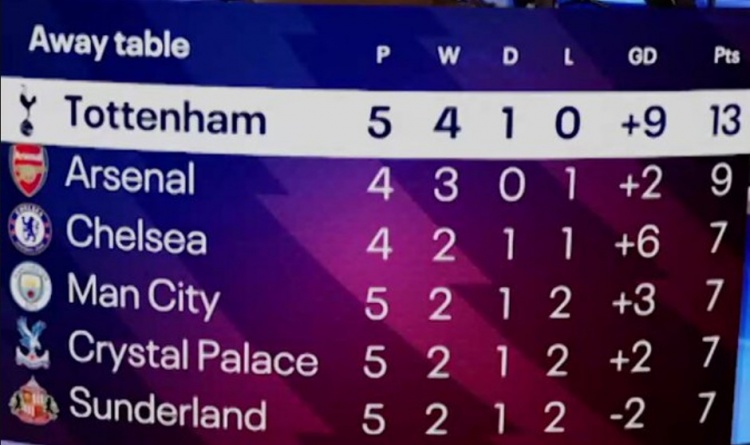 10月27日讯 BBC统计了本赛季各队英超客场比赛拿到的积分,并排出榜单,热刺4胜1平拿到13分最多,阿森纳3胜1负积9分次席。