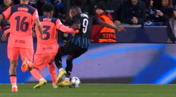 11月06日讯 欧冠第4轮布鲁日vs巴萨,第72分钟,博尔赫斯拿球杀入禁区,在巴尔德驻防下倒地,主裁判泰特第一时分判罚点球,但随后躬行看过VAR后取消了点球的判罚!