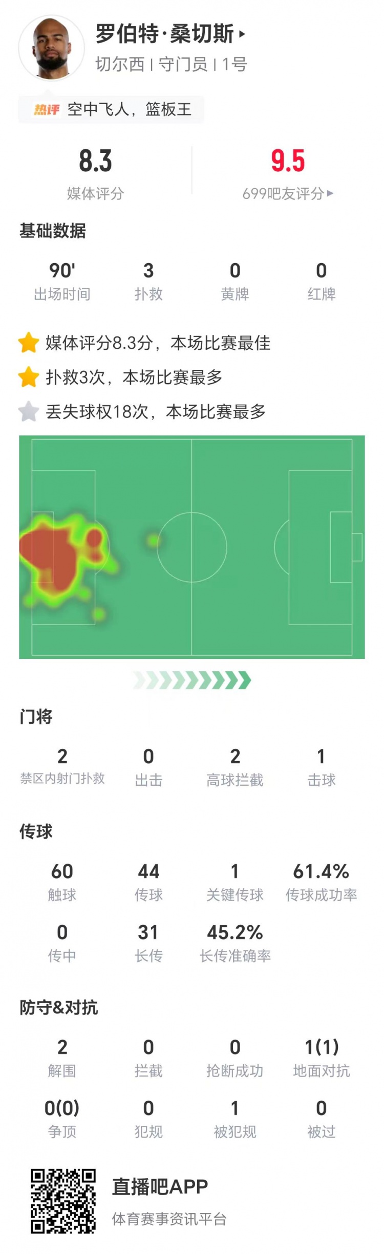 赛后时间统计数据表露,罗伯特-桑切斯本场比赛有两次扑救敌手禁区内射门,两次高球阻挡,1次击球,1次要津传球,两次突围,获评8.3分。
