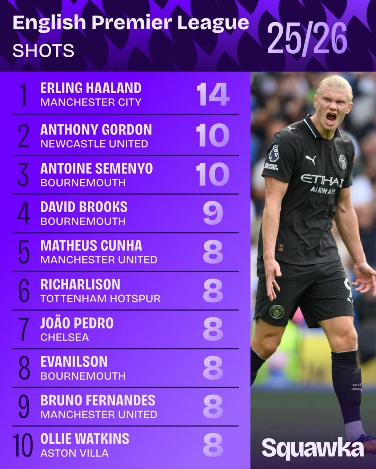 新赛季英超射门榜:哈兰德14次居首,B费、库尼亚、佩德罗在列