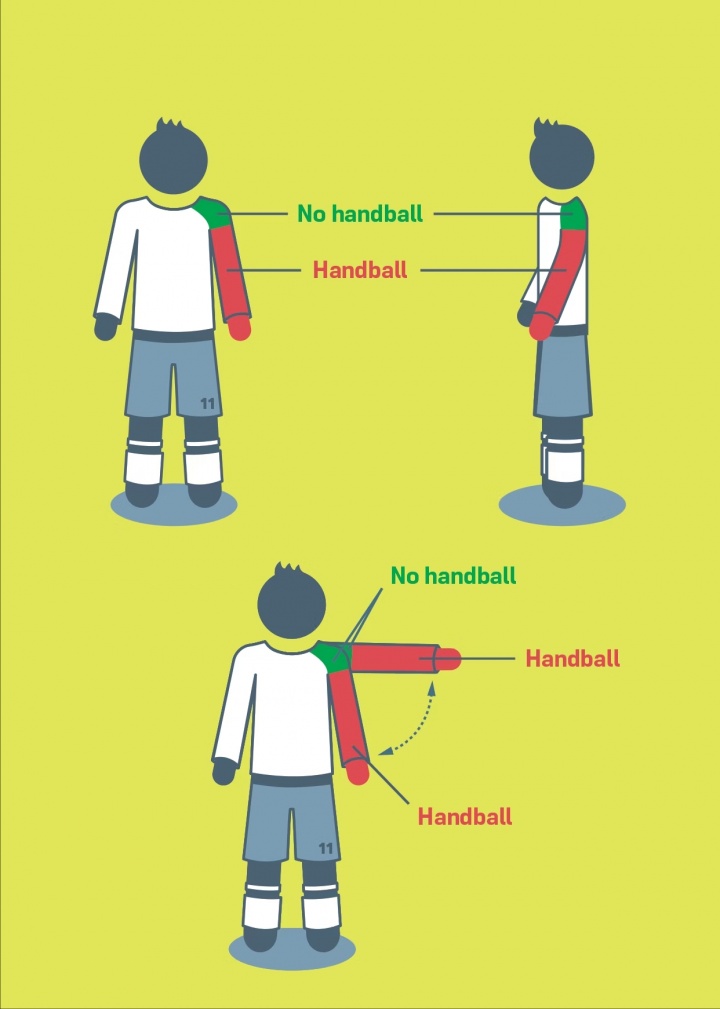在判定手球犯规时,手臂的上界限以腋窝底部为界。并非球员的手/手臂每次触球齐组成犯规。