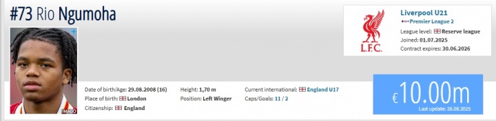 现年16岁的恩古莫哈昨天代表利物浦打进了他的英超首个进球,况兼是个绝杀制胜球。在现在德转16岁的同龄东说念主中,恩古莫哈毫无疑问是天下第一,而在他之下是400万欧的16岁梅斯小将马德约。