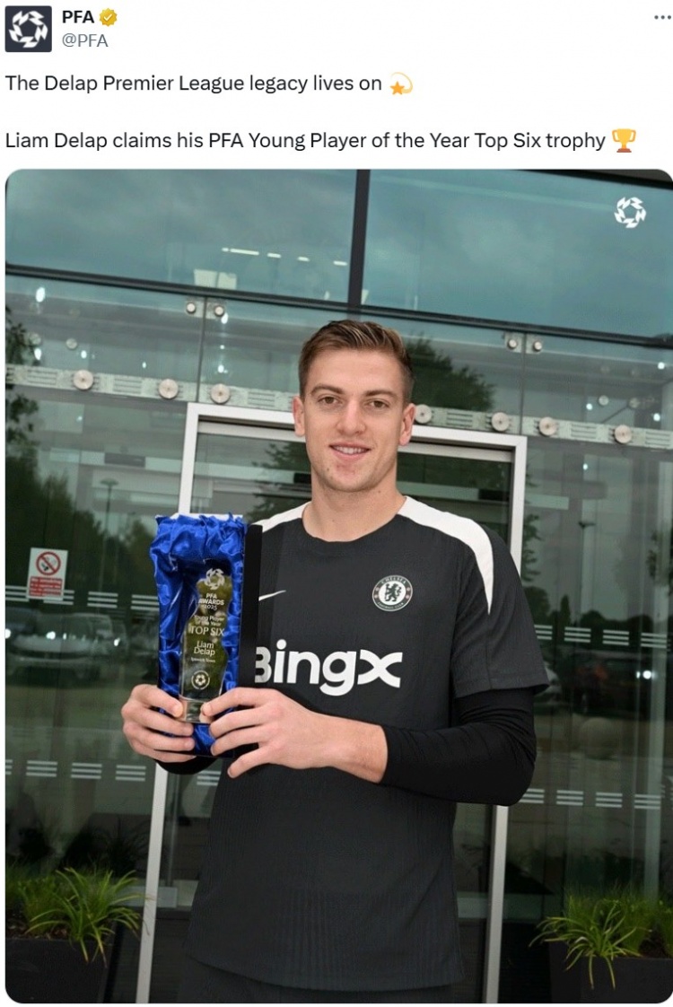 德拉普荣膺PFA年度最好年青球员前6,PFA官方晒球员领取奖杯像片