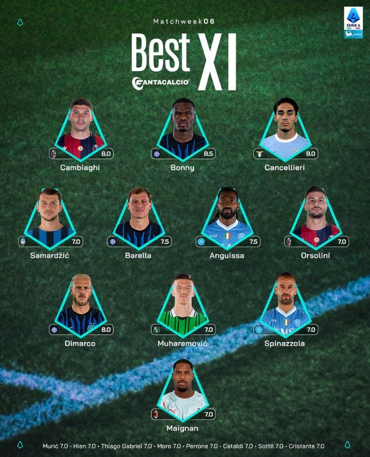 意甲官方本轮最好阵:博尼领衔国米3东说念主入选,迈尼昂在列