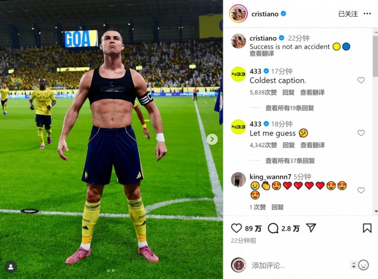 此役C罗传射立功,匡助利雅得顺利取胜,赛后他在酬酢媒体上晒出像片,配文:“得手绝非无意。”