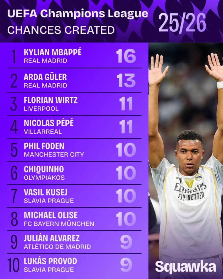 10月23日讯 Squawka统计了本赛季欧冠当今驱散的创造契机名次榜,姆巴佩位列第一,队友居莱尔第二,维尔茨第三。