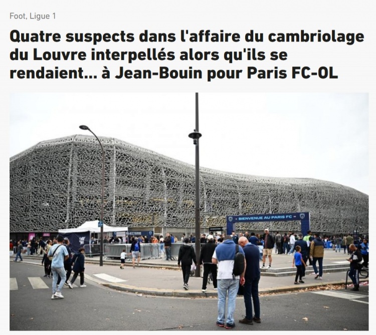 10月31日讯 据法媒报说念,卢浮宫盗窃案有5名新嫌疑东说念主被捕,其中4东说念主被捕时正在赶赴让-布安球场不雅看巴黎FC和里昂的法甲比赛。