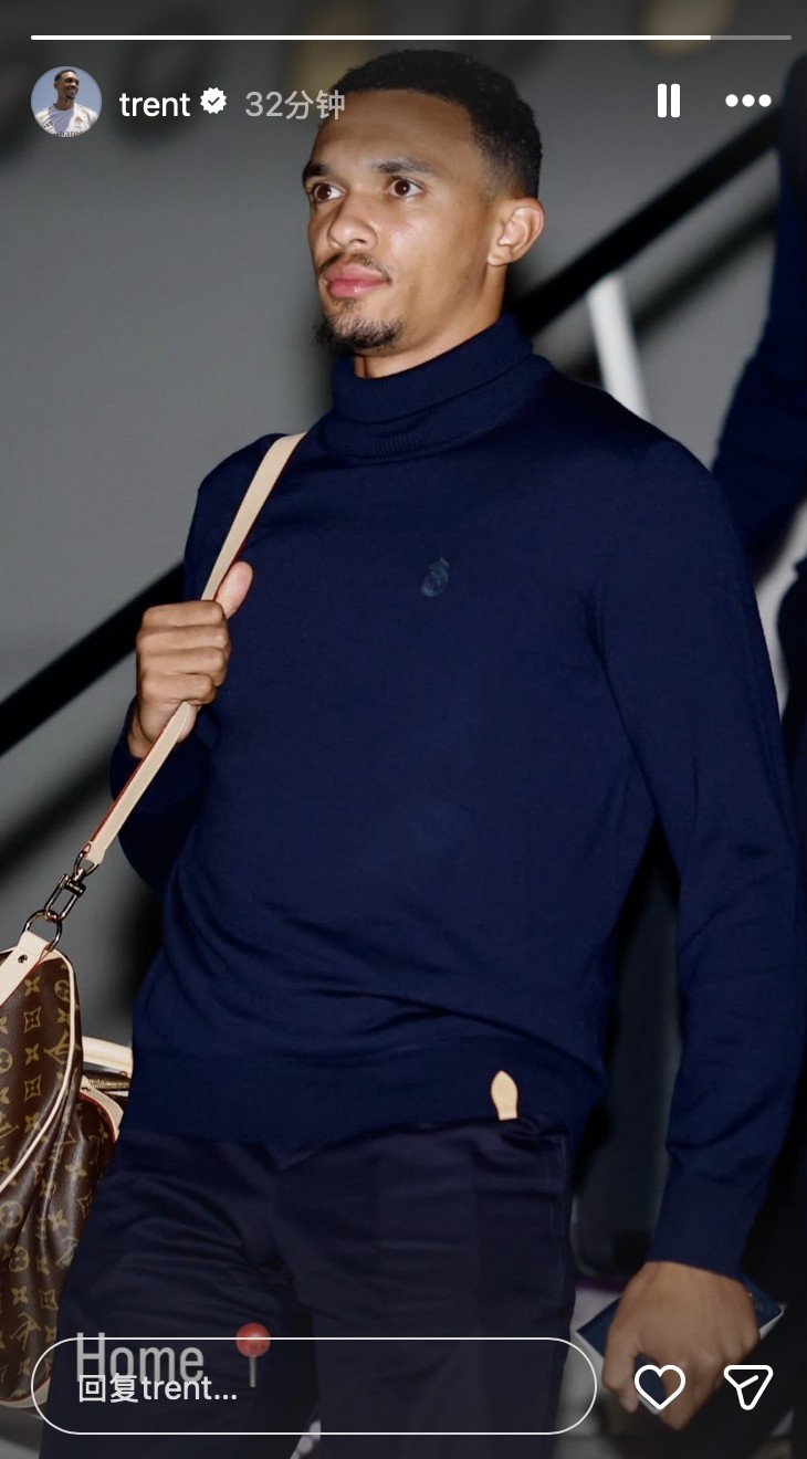 11月4日讯 皇马将在本轮欧冠小组赛中客场对阵利物浦,皇马右后卫阿诺德在个东谈主INS上晒照,抵达利物浦。