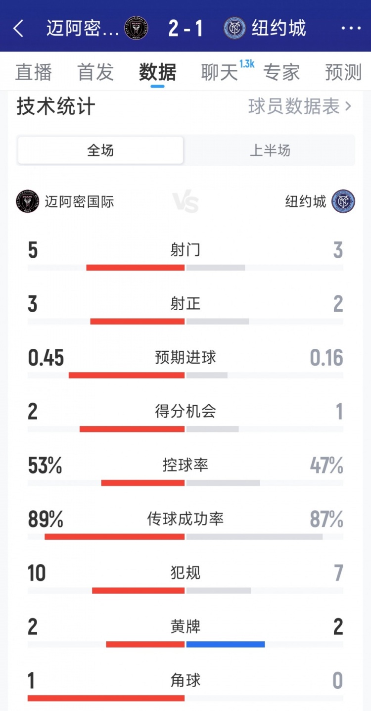 11月30日讯 好意思职联分区决赛迈阿密海外对阵纽约城半场战罢,迈阿密海外2-1暂时逾越,以下为两边半场数据对比: