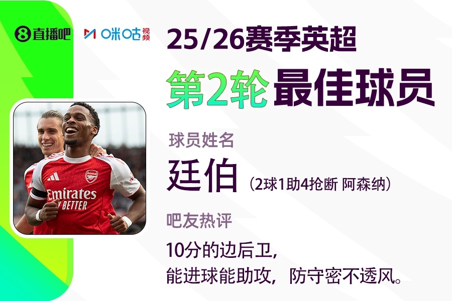 8月27日讯 2025-2026赛季英超火热进行中,和咪咕体育集会发起每轮英超最好球员评比举止!第二轮评比遵守结出炉,阿森纳后卫廷伯2球1助4抢断,攻守兼备的他赢得吧友近四万吧友的投票赞助,以较大上风当选 【X咪咕体育英超第2轮最好球员】!