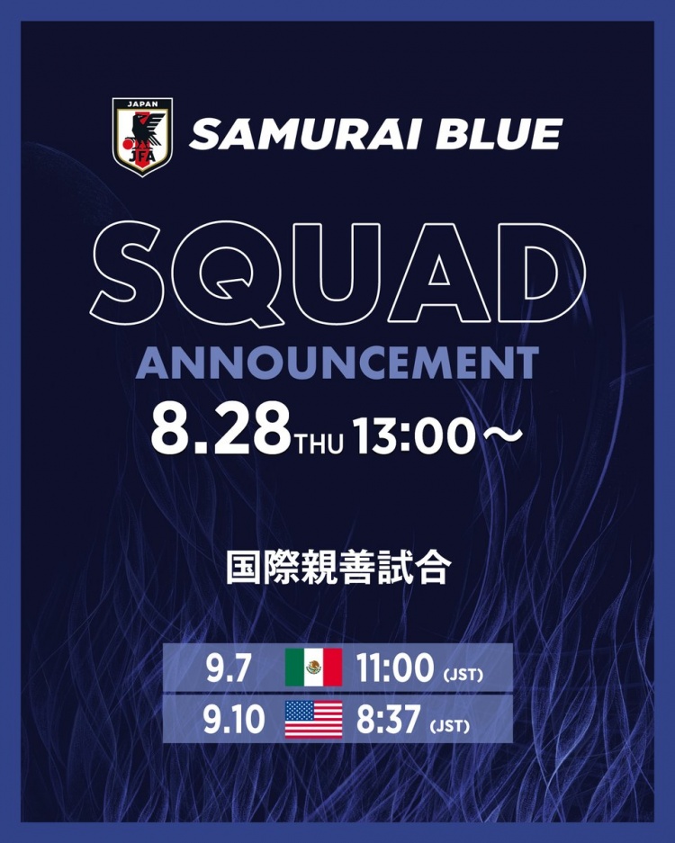 日本将在9月份进行两场友谊赛,9月7日对阵墨西哥、9月10日对阵好意思国。