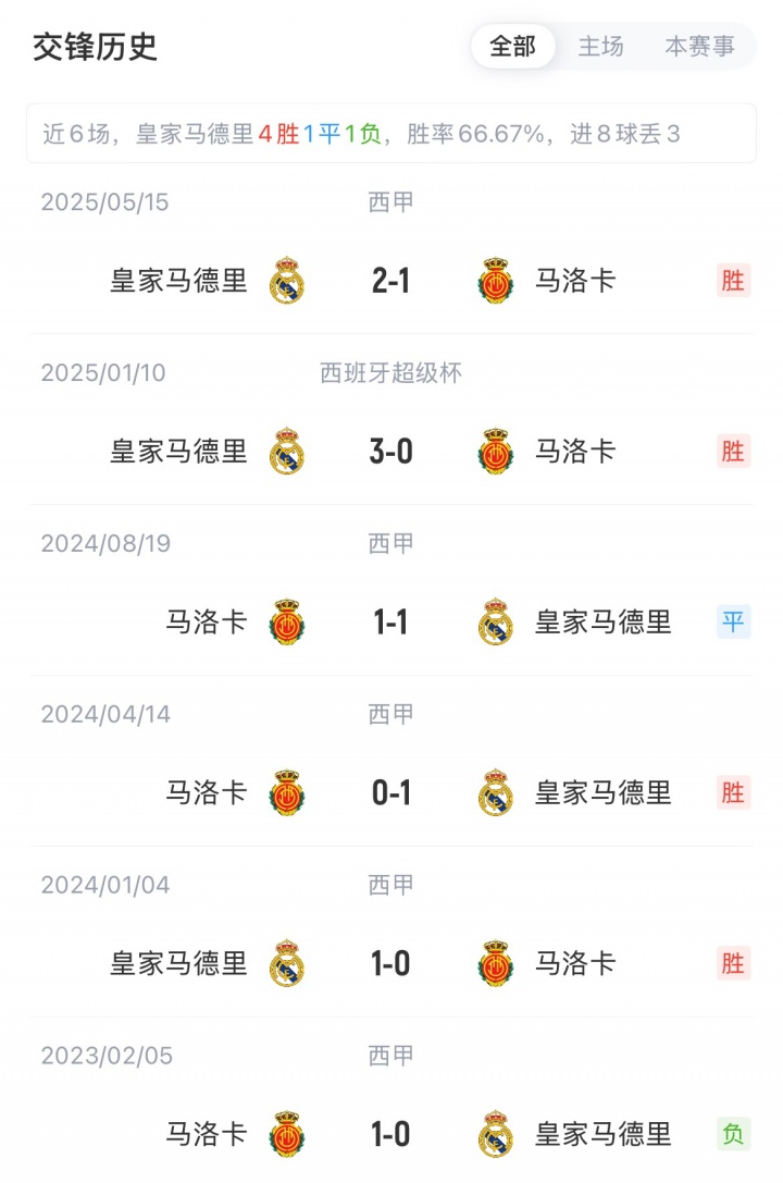 皇马开局两连胜暂排第三,马洛卡则是1平1负。皇马濒临马洛卡已五场不败。