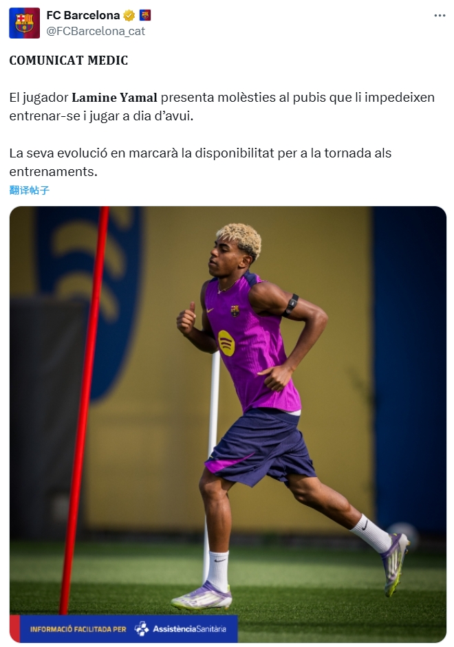 巴萨官方:亚马尔耻骨不适,无法参与当天实际和比赛