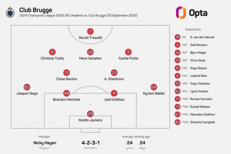 10月1日讯 欧冠联赛阶段第2轮比赛,布鲁日赶赴客场挑战亚特兰大。本场比赛,布鲁日首发平均年齿仅为24岁24天,这创下了欧冠历史首发平均年齿最年青记载。