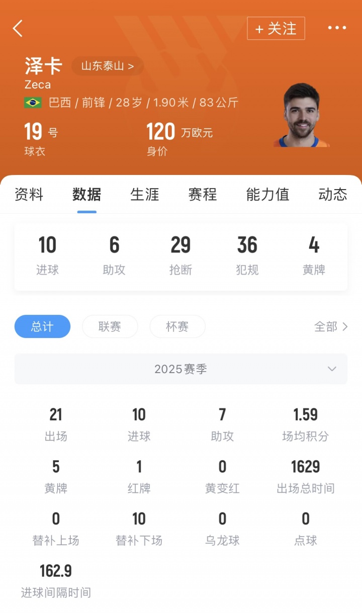 2024年加盟山东后,泽卡首个赛季遭受伤病困扰,2025年他终于迎来结识的出场,21场比赛孝敬10球7助。