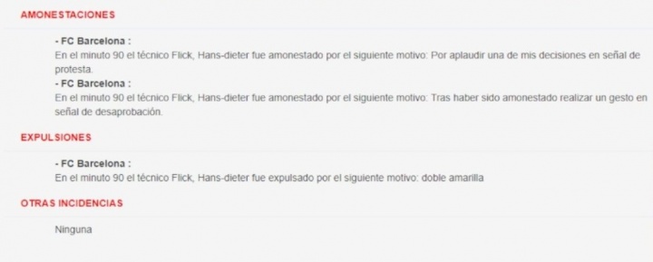 10月19日讯 西甲第9轮,巴萨2-1绝杀赫罗纳。比赛补时阶段,弗里克不悦裁判,两黄变一红被罚下。赛后的裁判敷陈中给出了弗里克吃牌的原因。