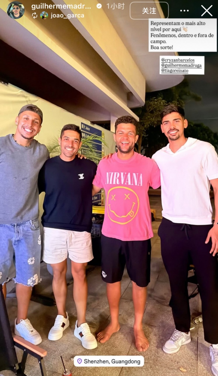 10月20日讯 当天,泰山队外助马德鲁加更新社媒,晒出和队友克雷桑等的合影,定位知道几东谈主在深圳。