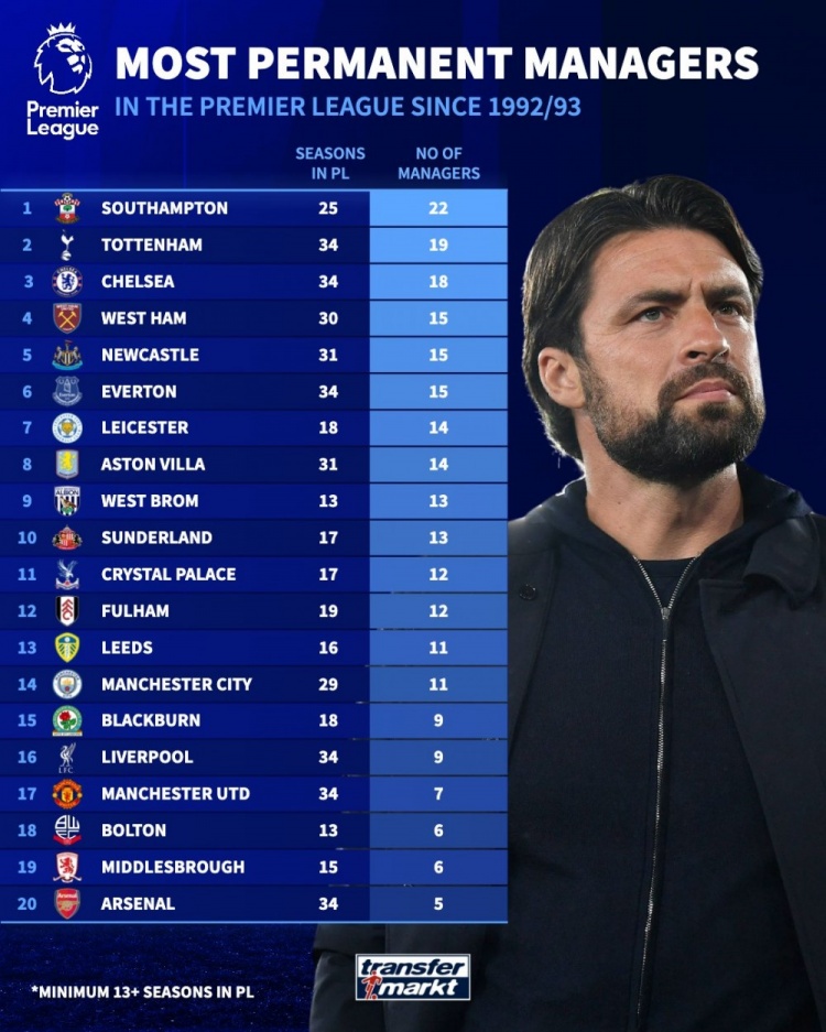 英超历史肃肃主帅换帅榜:热刺19次、切尔西18次 阿森纳仅5次最少