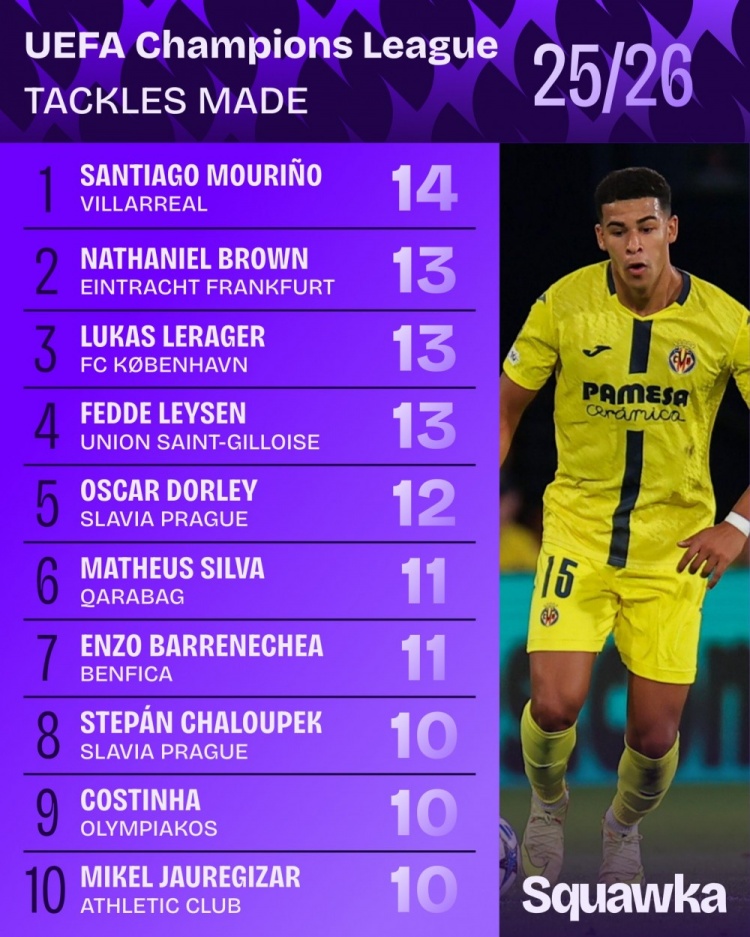 10月23日讯 本赛季欧冠联赛阶段已战罢3轮,Squawka统计了到现在纵容的铲球榜单,比利亚雷亚此后卫圣地亚哥-穆里尼奥14次序一,法兰克福后卫布朗等三东说念主13次分列二至四位。