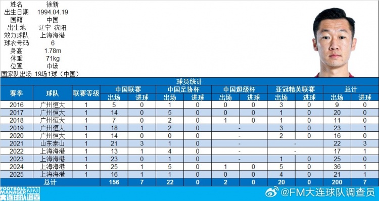 徐新完成中国俱乐部各项处事赛事出战200场,共打入7球