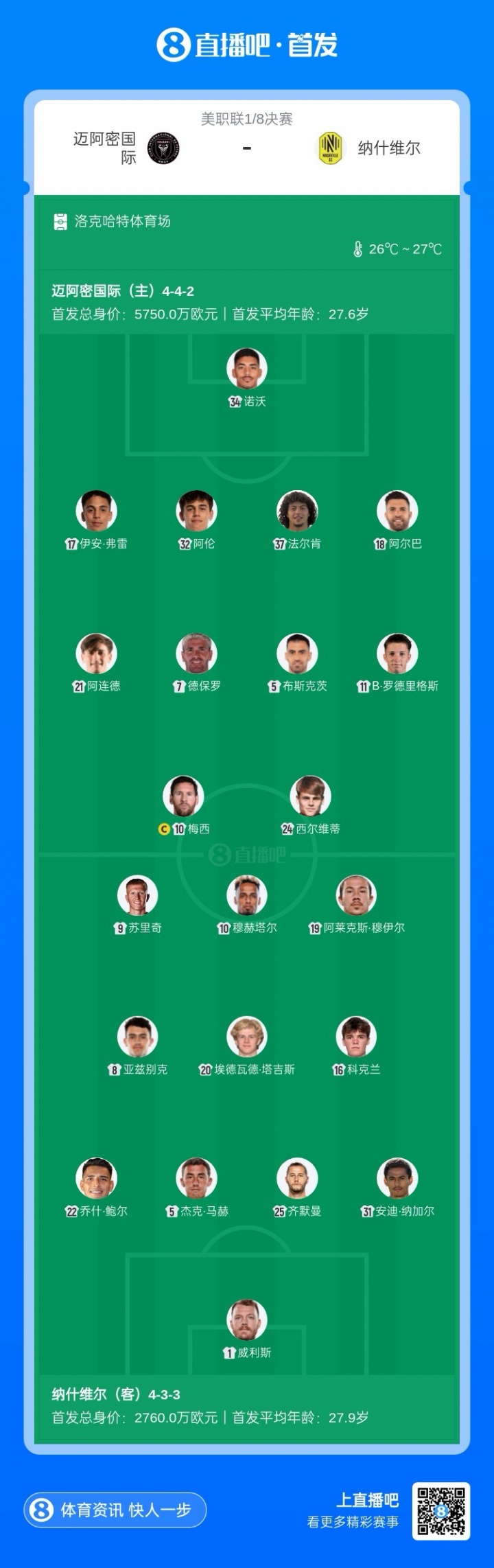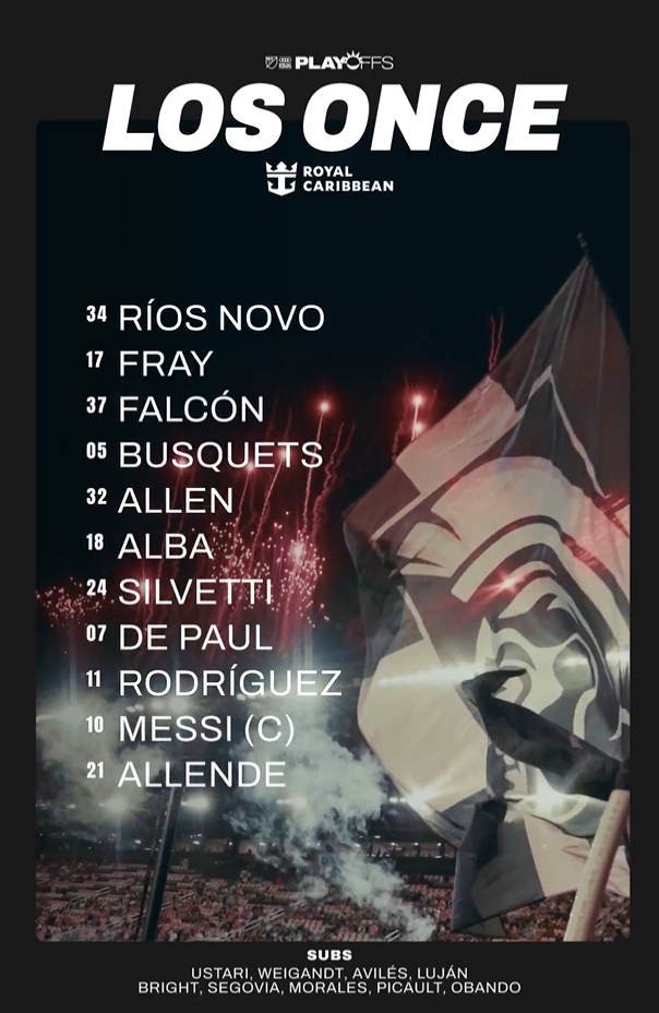 迈阿密国外首发:34-诺沃、17-伊安·弗雷、37-法尔肯、32-阿伦、18-阿尔巴、21-阿连德、7-德保罗、5-布斯克茨、10-梅西、11-B·罗德里格斯、24-西尔维蒂