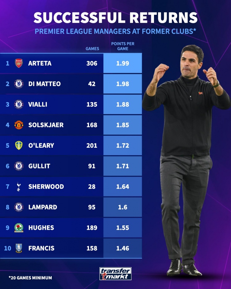 合手教英超老东家场均积分名次:阿尔特塔1.99分居首,迪马特奥次席