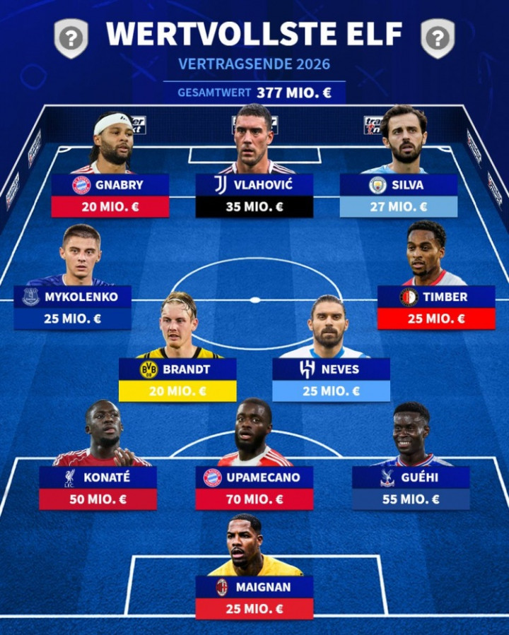 直播吧12月31日讯德转列自明日起不错与其他球队道判夏窗免签加盟的球员声势,这些球员面前的协议齐将在2026年6月30日到期,弗拉霍维奇、格伊、于帕梅卡诺在列。