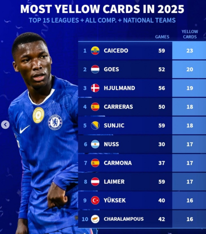 2025年已过程去,《转会市集》也统计了前15联赛球员的俱乐部+国度队各项赛事总黄牌次数,凯塞多居首。