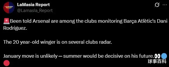 《E-Noticies》指出,由于亚马尔稳坐巴萨主力位置,罗德里格斯在短期内很难赢得干涉巴萨一线队的契机,弗里克对他的转会捏怒放作风。而另一音书源、专注巴萨青训的X账号LaMasia Report(近2万粉)也阐述:“阿森纳正在关怀巴萨B队的达尼·罗德里格斯。20岁边锋已干涉多支球队视线,一月转会可能性低,夏天将成关键节点。”