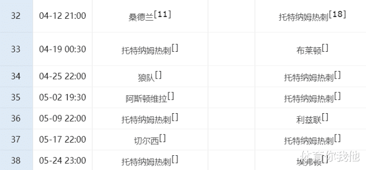 本赛季,英超保级形势异常剧烈 ,热刺的低迷,让他们成为降级大热门之一。不过热刺如今依然掌握了自己的命运。从赛程来看,热刺最后7场赛事 ,除了客场应战 对阵维拉和切尔西拿分希望渺茫之外,其他5场赛事 对手实力都不算太强,热刺如果能找回竞技状态 ,5场拿到15分的话,就有很大希望成功保级。