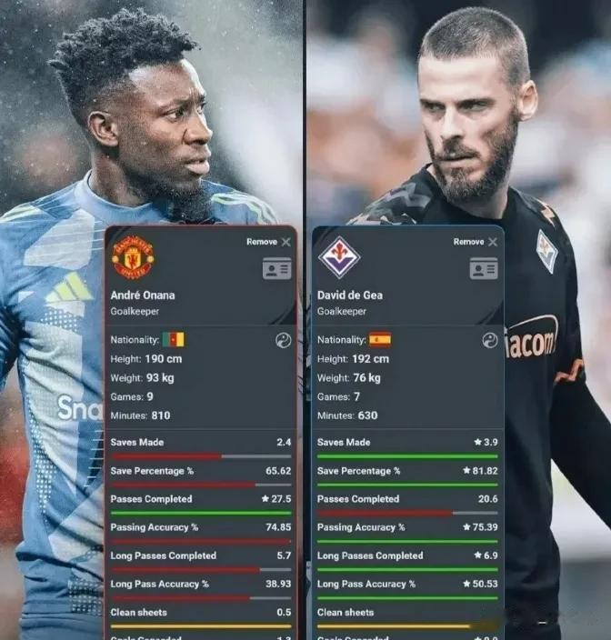 德赫亚场均孝敬3.9次扑救,扑救得胜率81.82%;奥纳纳场均2.4次扑救,扑救得胜率仅65.62%。