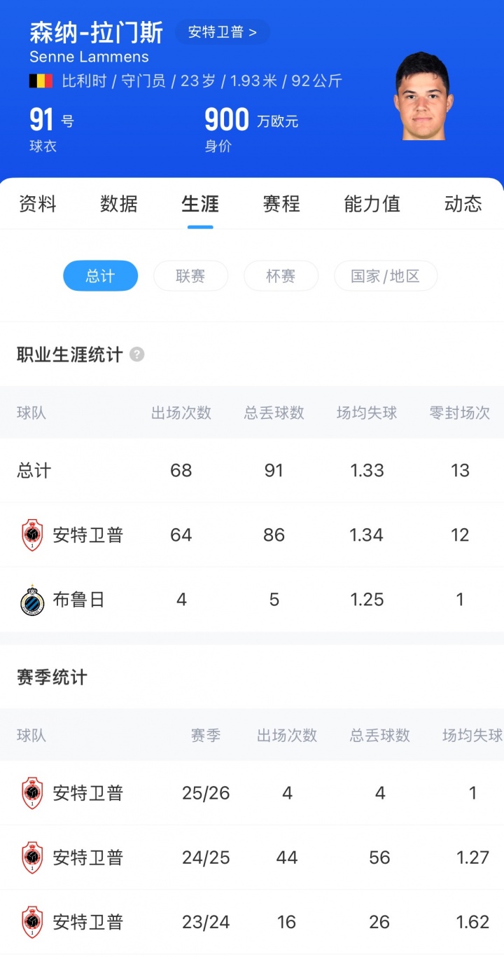 拉门斯现年23岁,比利时门将,身高1米93,上赛季为安特卫普出场44次。现在球员德回身价为900万欧元。