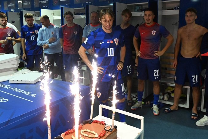 莫德里奇迎来40岁寿辰,克罗地亚全队赛后在更衣室为这位据说队长庆生。